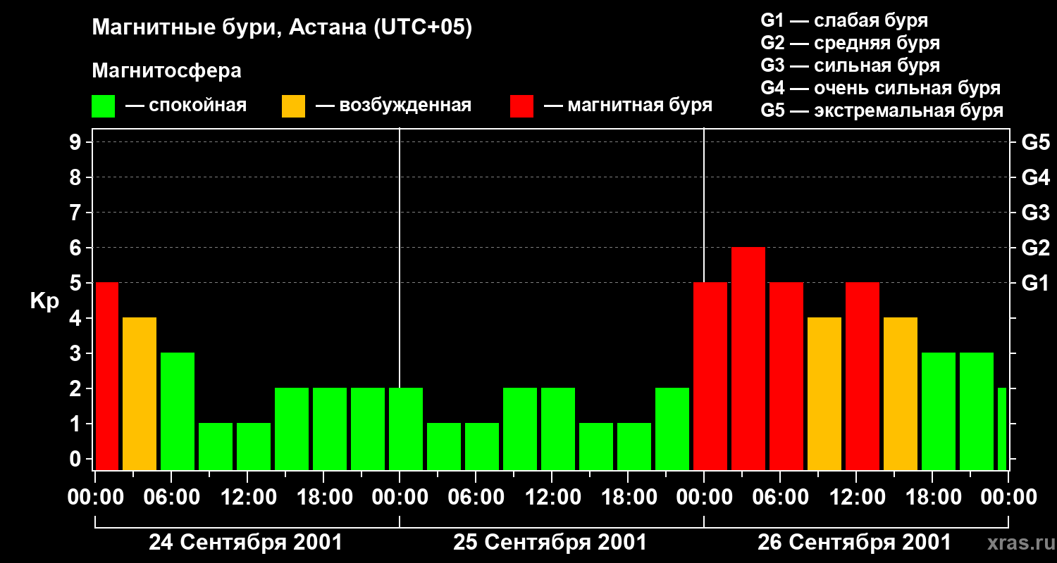 Изменения геомагнитного индекса Kp с 24 по 26 сентября 2001 года для средних широт