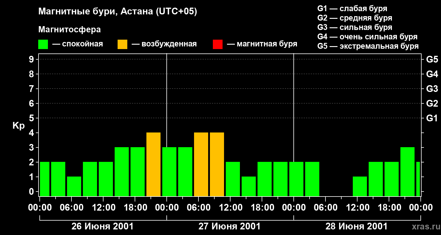 Изменения геомагнитного индекса Kp с 26 по 28 июня 2001 года для средних широт
