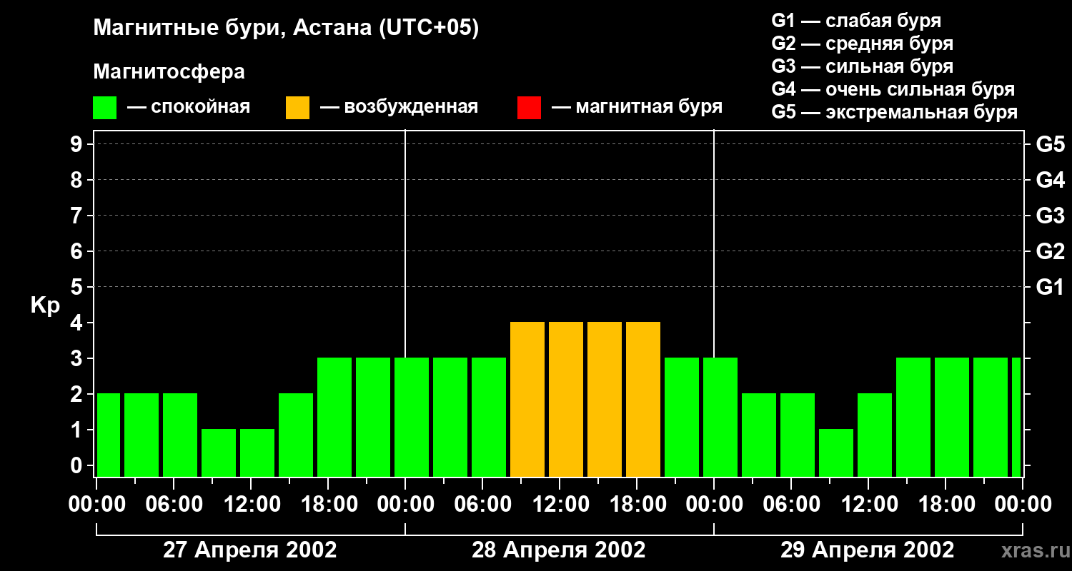Изменения геомагнитного индекса Kp с 27 по 29 апреля 2002 года для средних широт