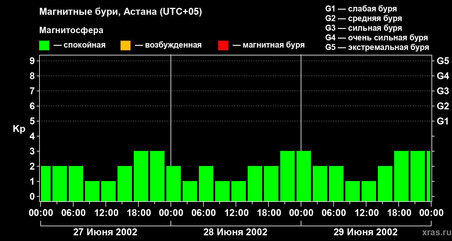 Изменения геомагнитного индекса Kp с 27 по 29 июня 2002 года для средних широт