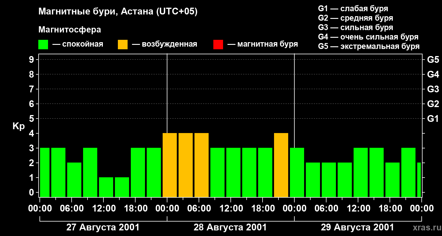 Изменения геомагнитного индекса Kp с 27 по 29 августа 2001 года для средних широт