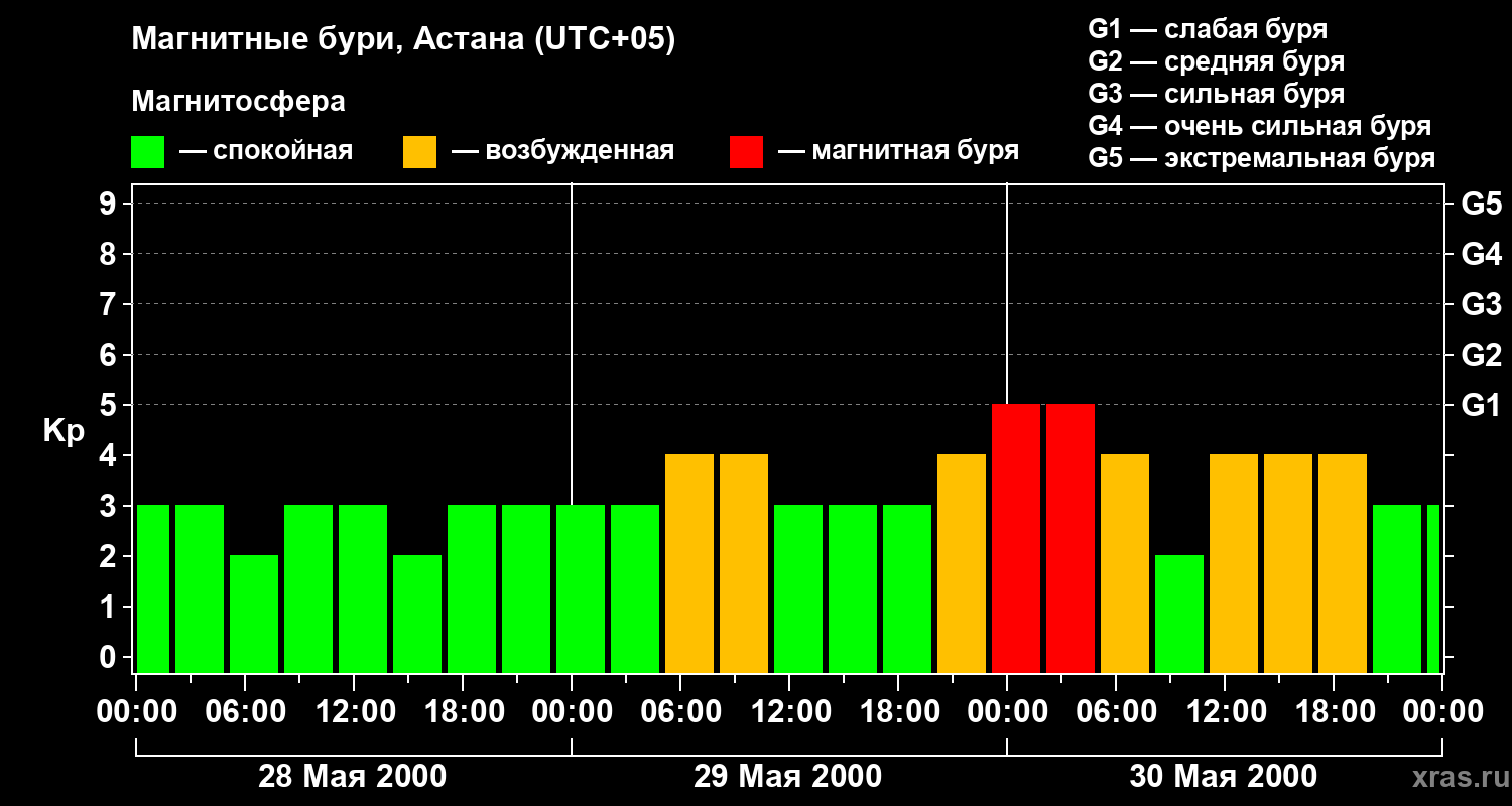 Изменения геомагнитного индекса Kp с 28 по 30 мая 2000 года для средних широт