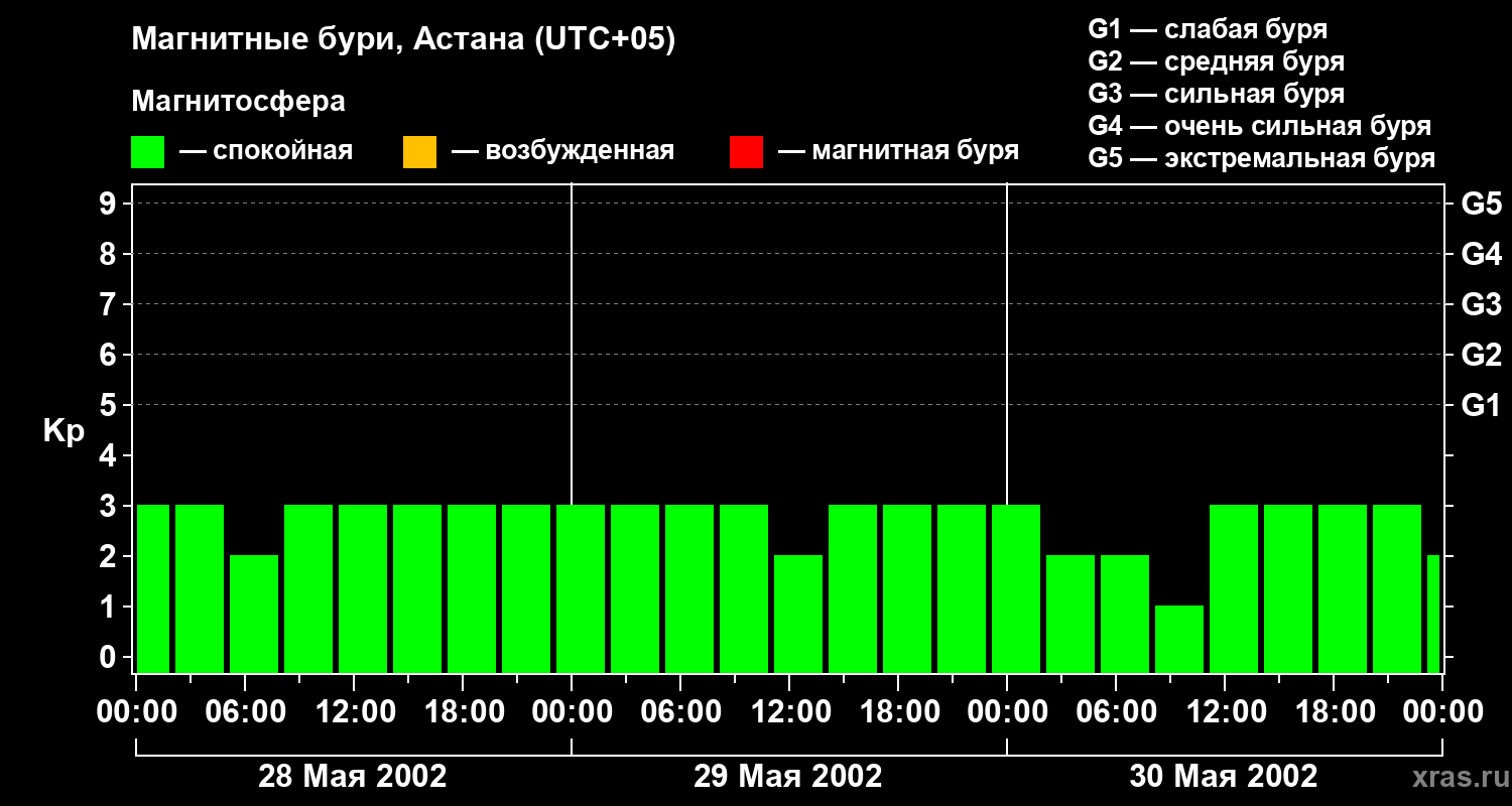 Изменения геомагнитного индекса Kp с 28 по 30 мая 2002 года для средних широт
