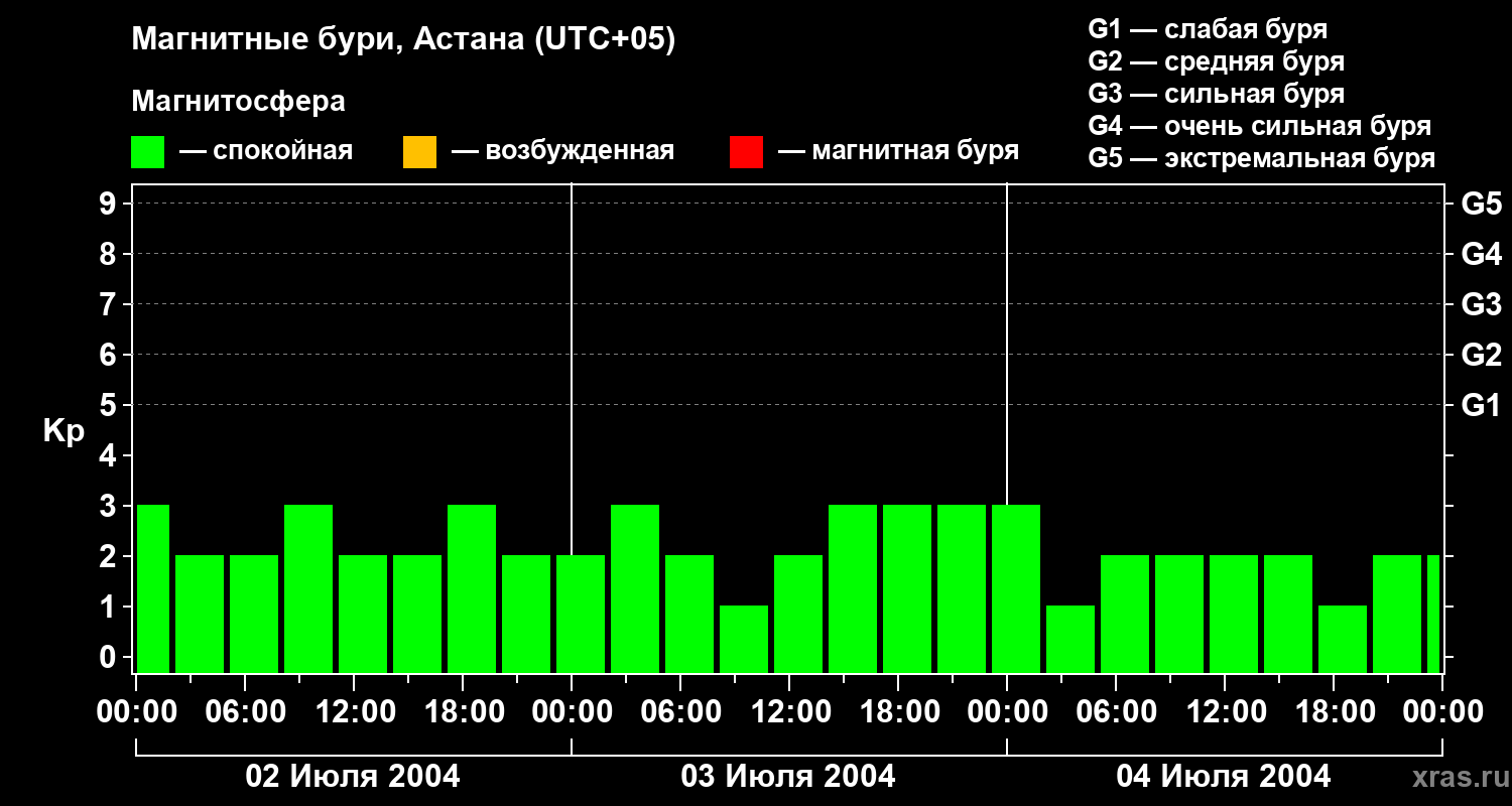 Изменения геомагнитного индекса Kp с 2 по 4 июля 2004 года для средних широт