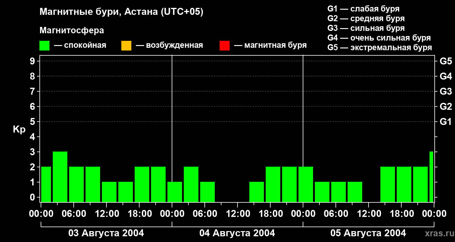 Изменения геомагнитного индекса Kp с 3 по 5 августа 2004 года для средних широт