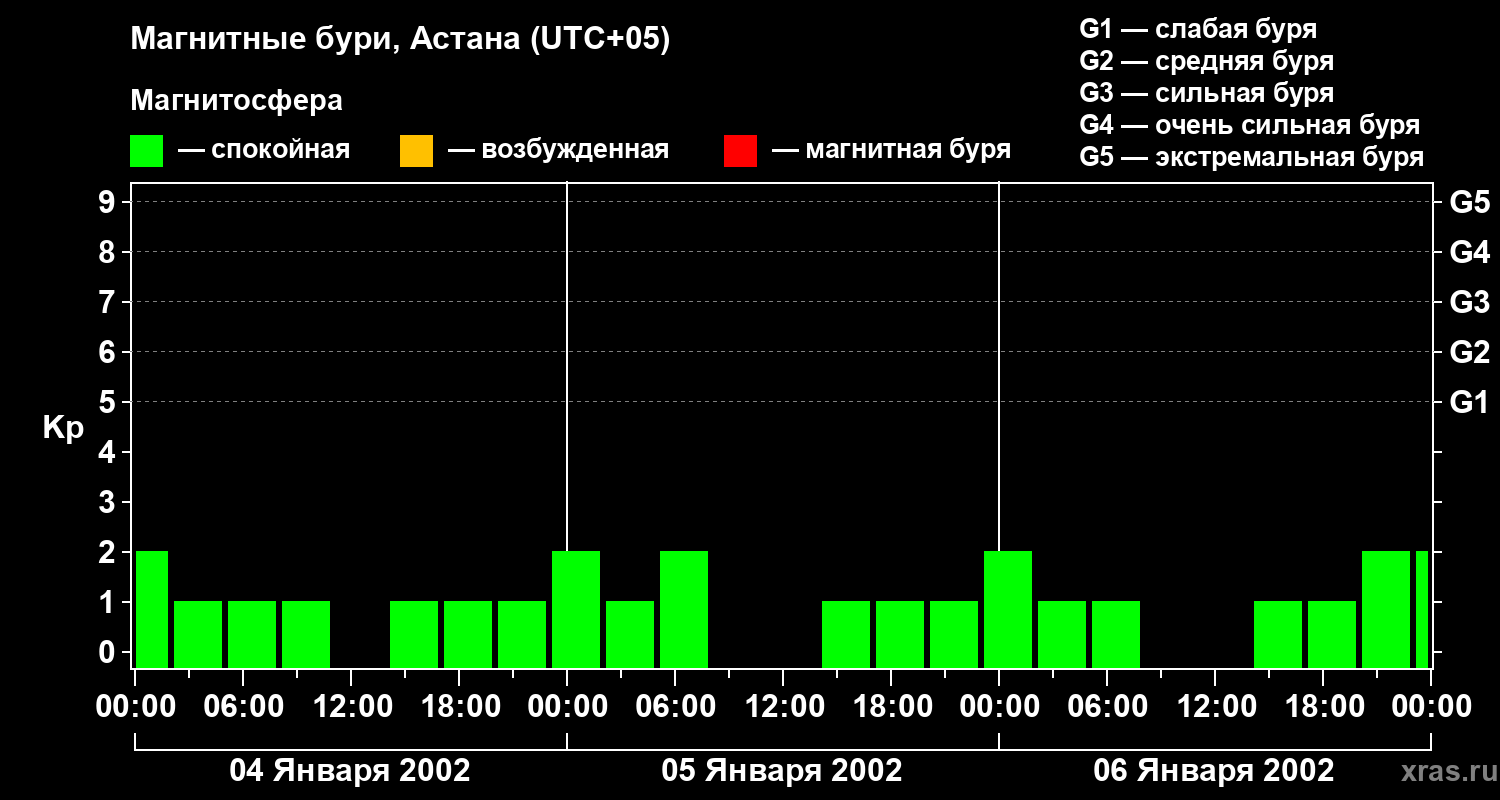 Изменения геомагнитного индекса Kp с 4 по 6 января 2002 года для средних широт