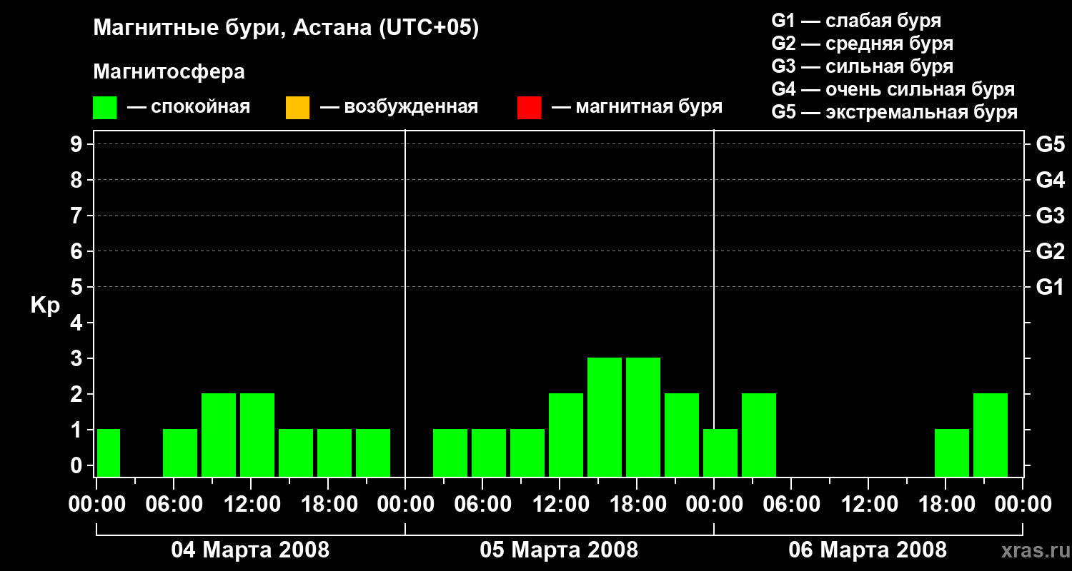 Изменения геомагнитного индекса Kp с 4 по 6 марта 2008 года для средних широт