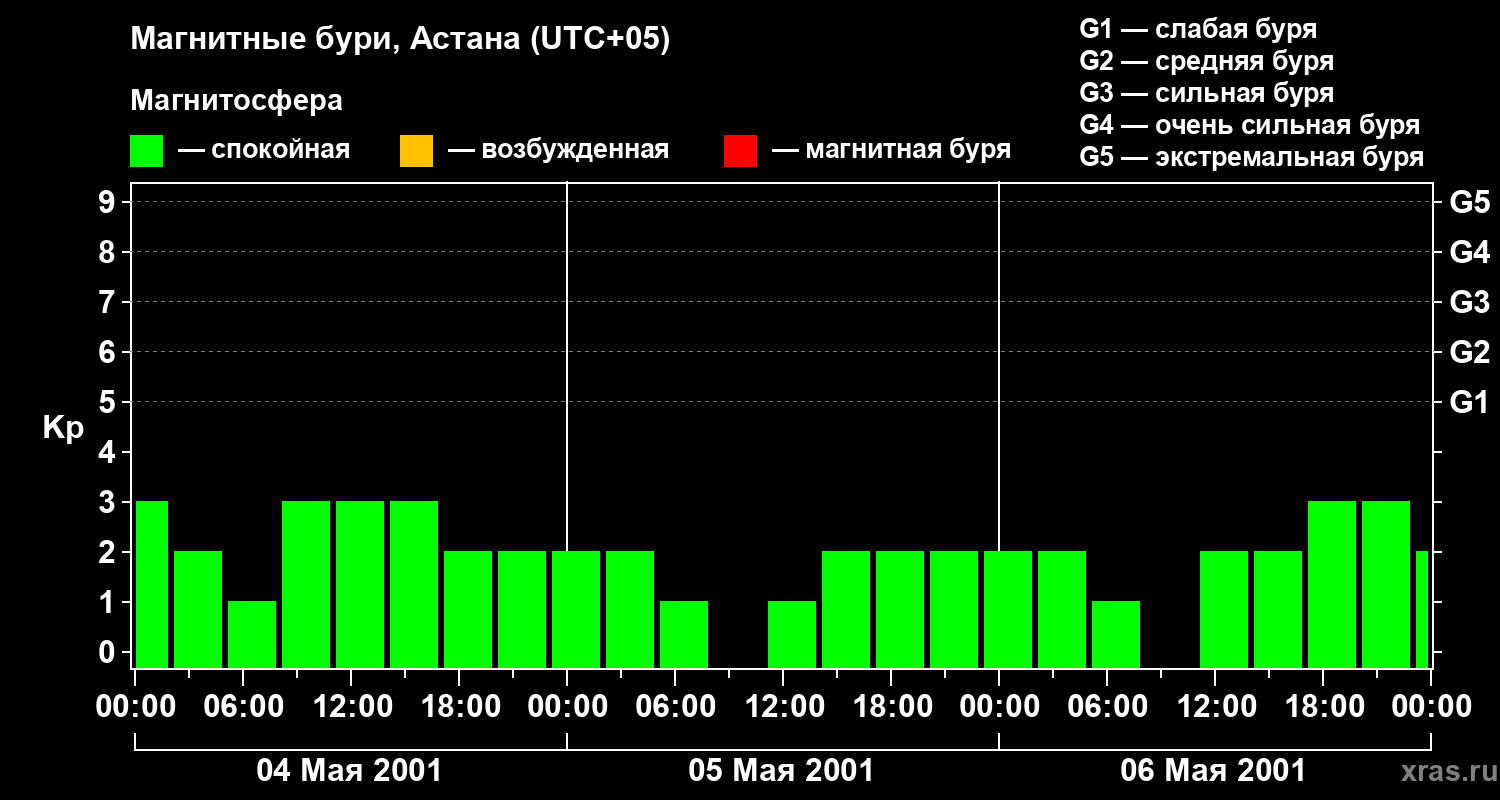 Изменения геомагнитного индекса Kp с 4 по 6 мая 2001 года для средних широт