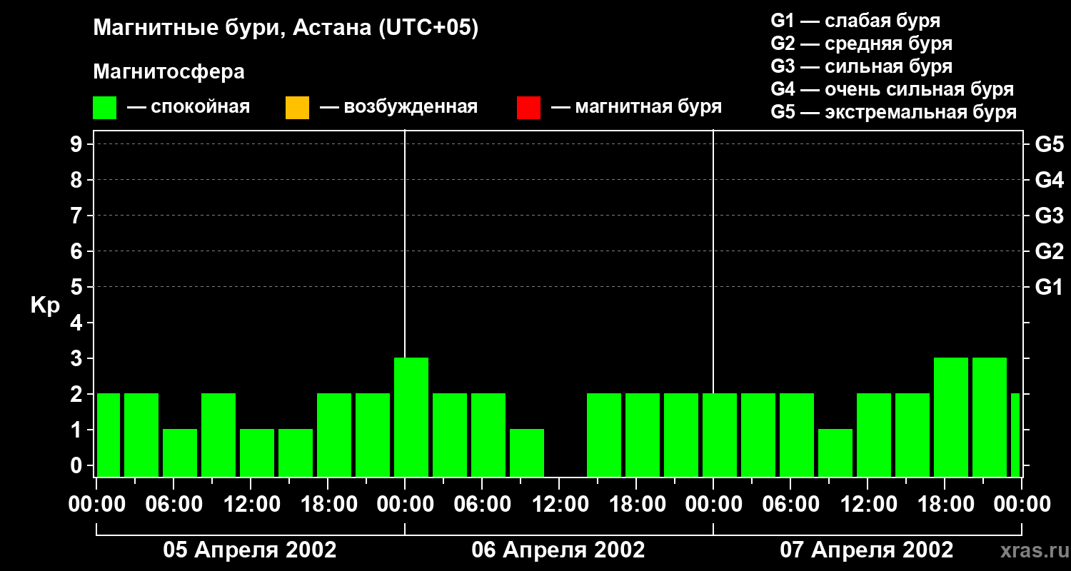 Изменения геомагнитного индекса Kp с 5 по 7 апреля 2002 года для средних широт