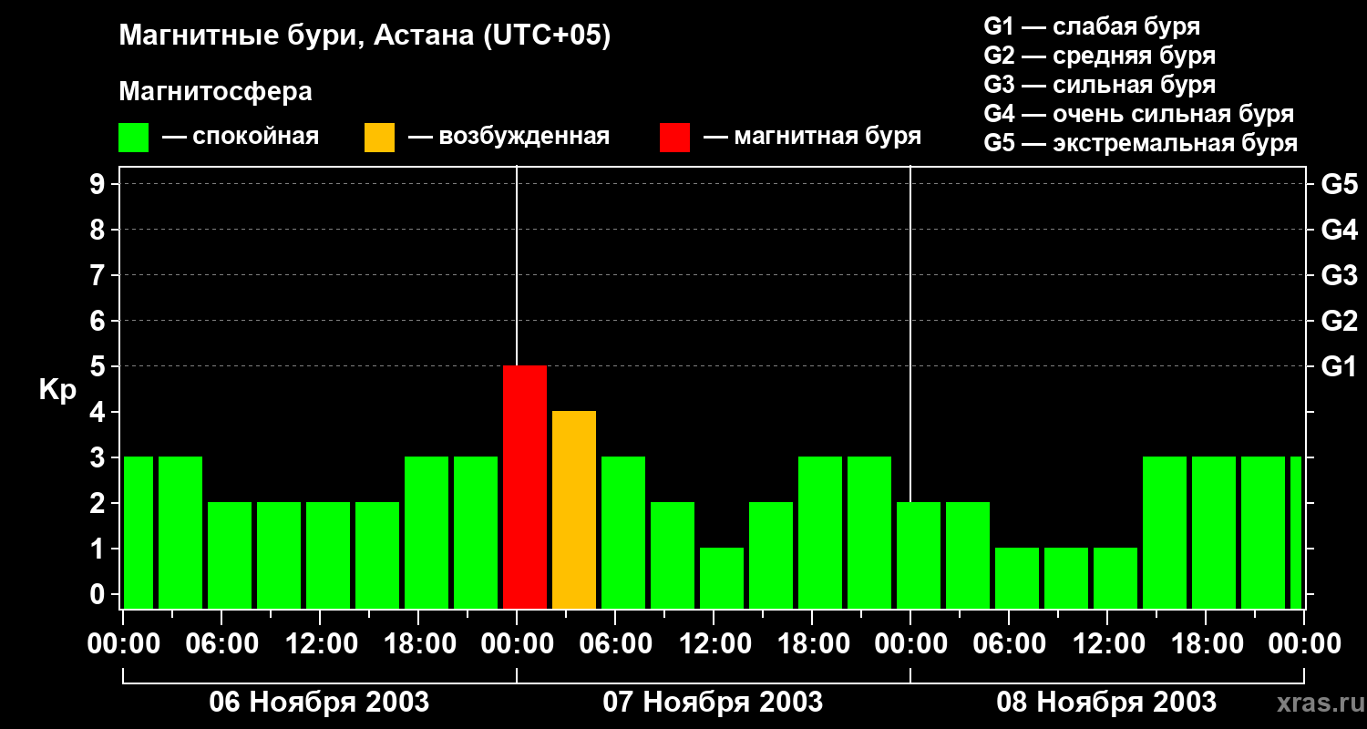 Изменения геомагнитного индекса Kp с 6 по 8 ноября 2003 года для средних широт