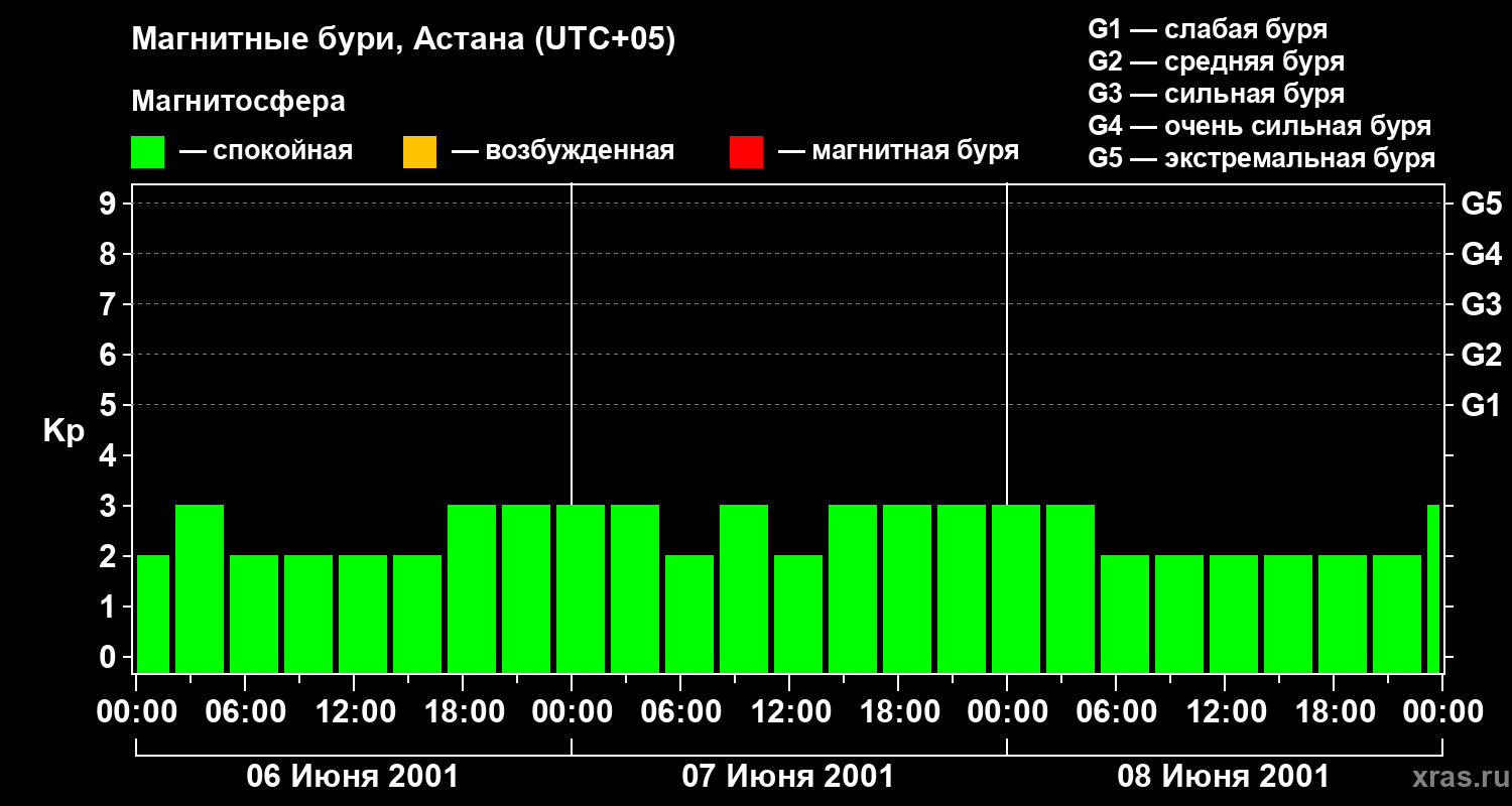 Изменения геомагнитного индекса Kp с 6 по 8 июня 2001 года для средних широт