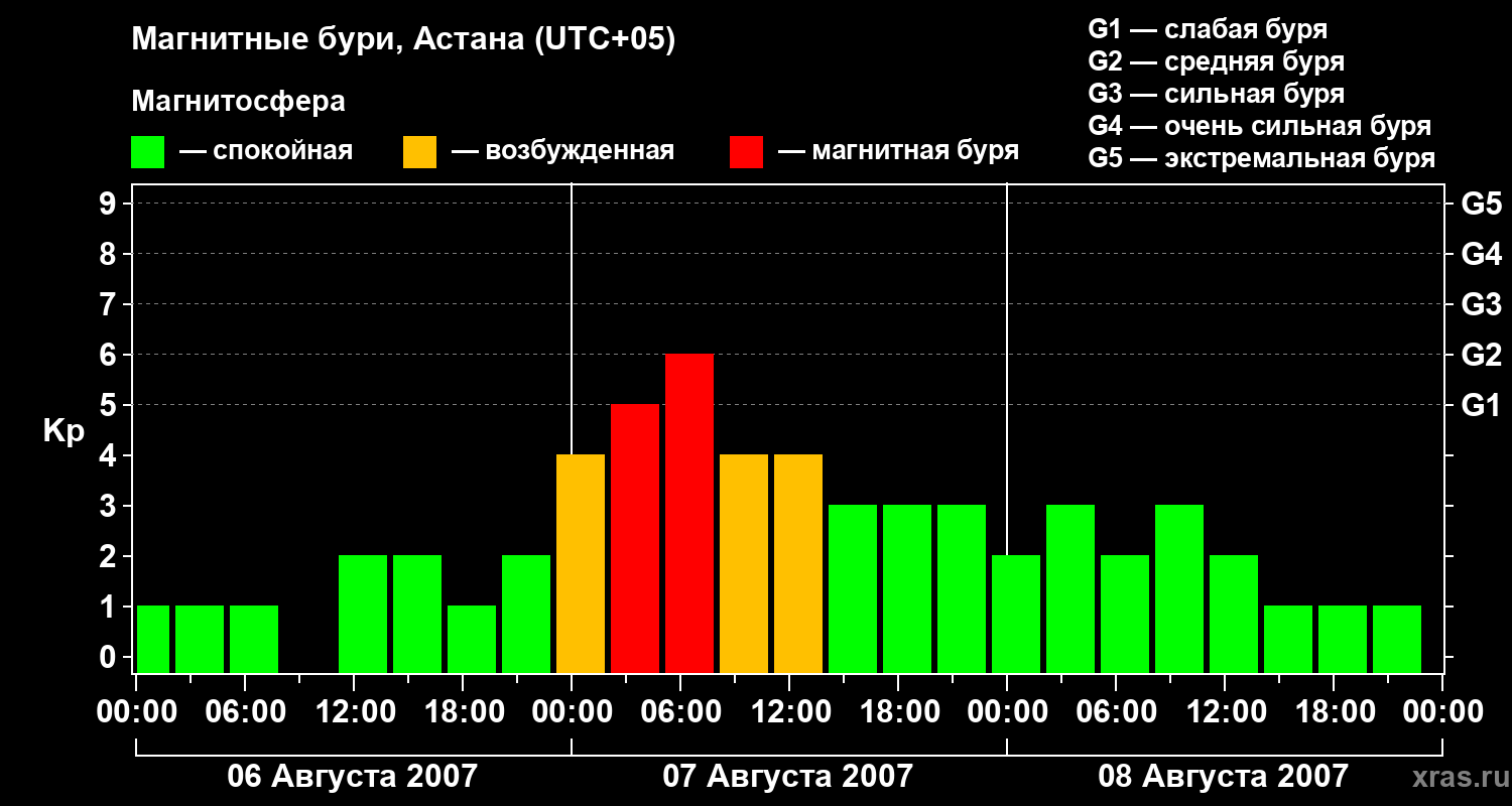 Изменения геомагнитного индекса Kp с 6 по 8 августа 2007 года для средних широт