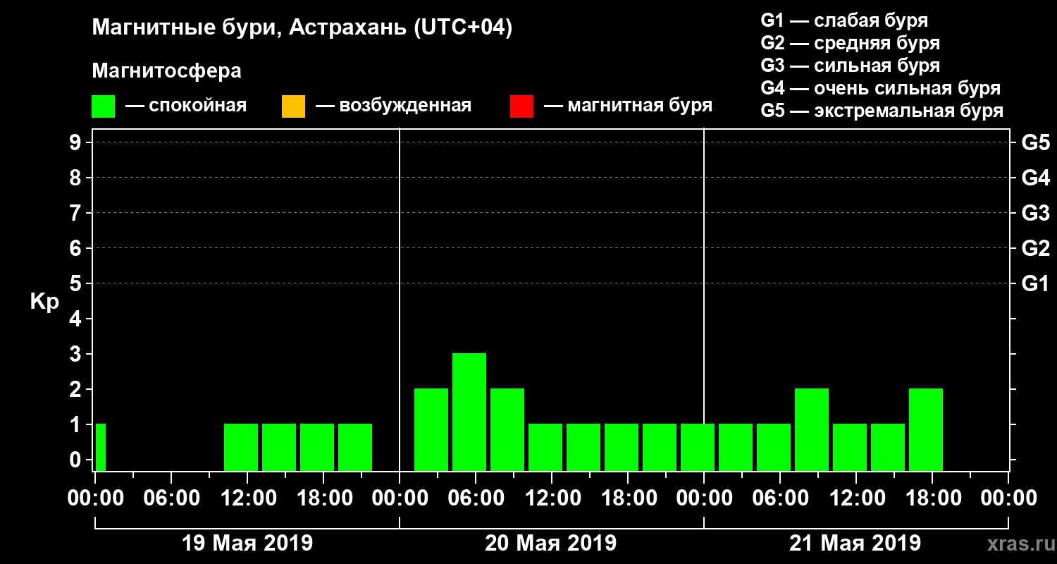 Изменения геомагнитного индекса Kp с 19 по 21 мая 2019 года для средних широт
