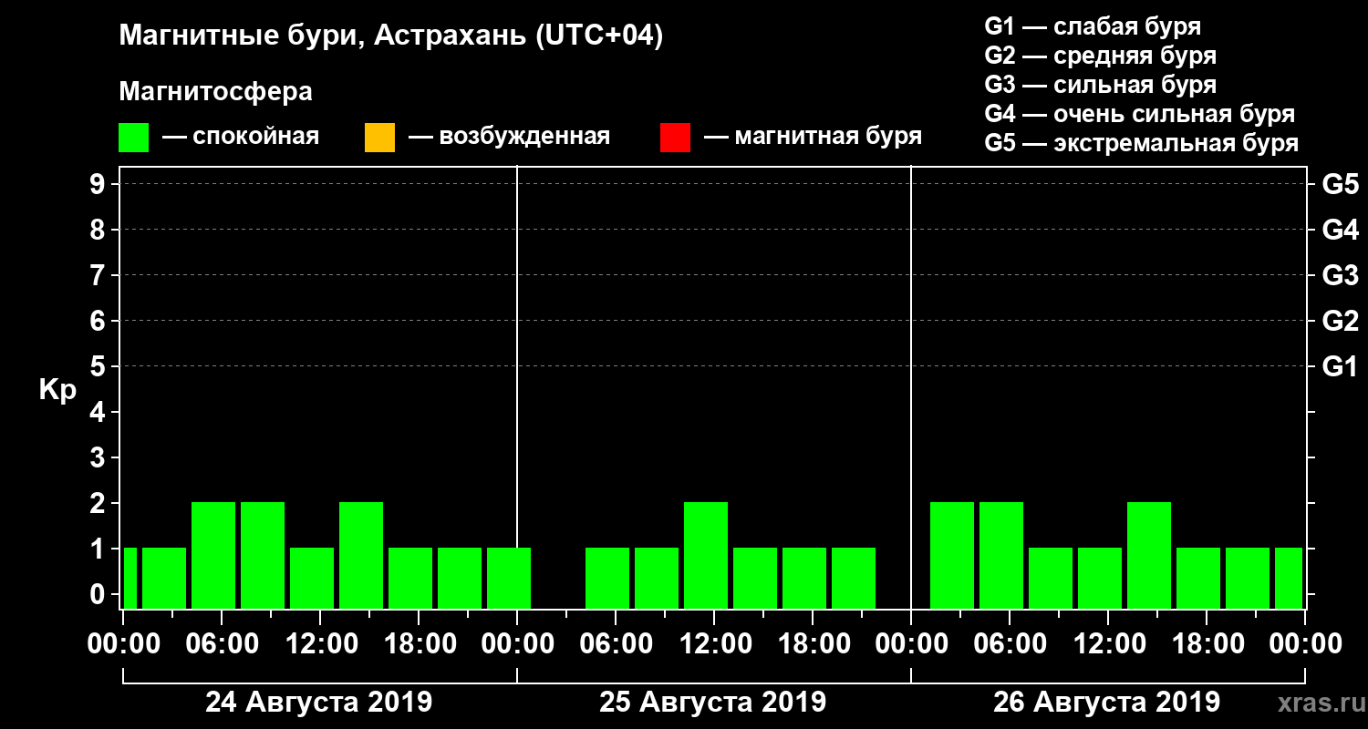 Изменения геомагнитного индекса Kp с 24 по 26 августа 2019 года для средних широт