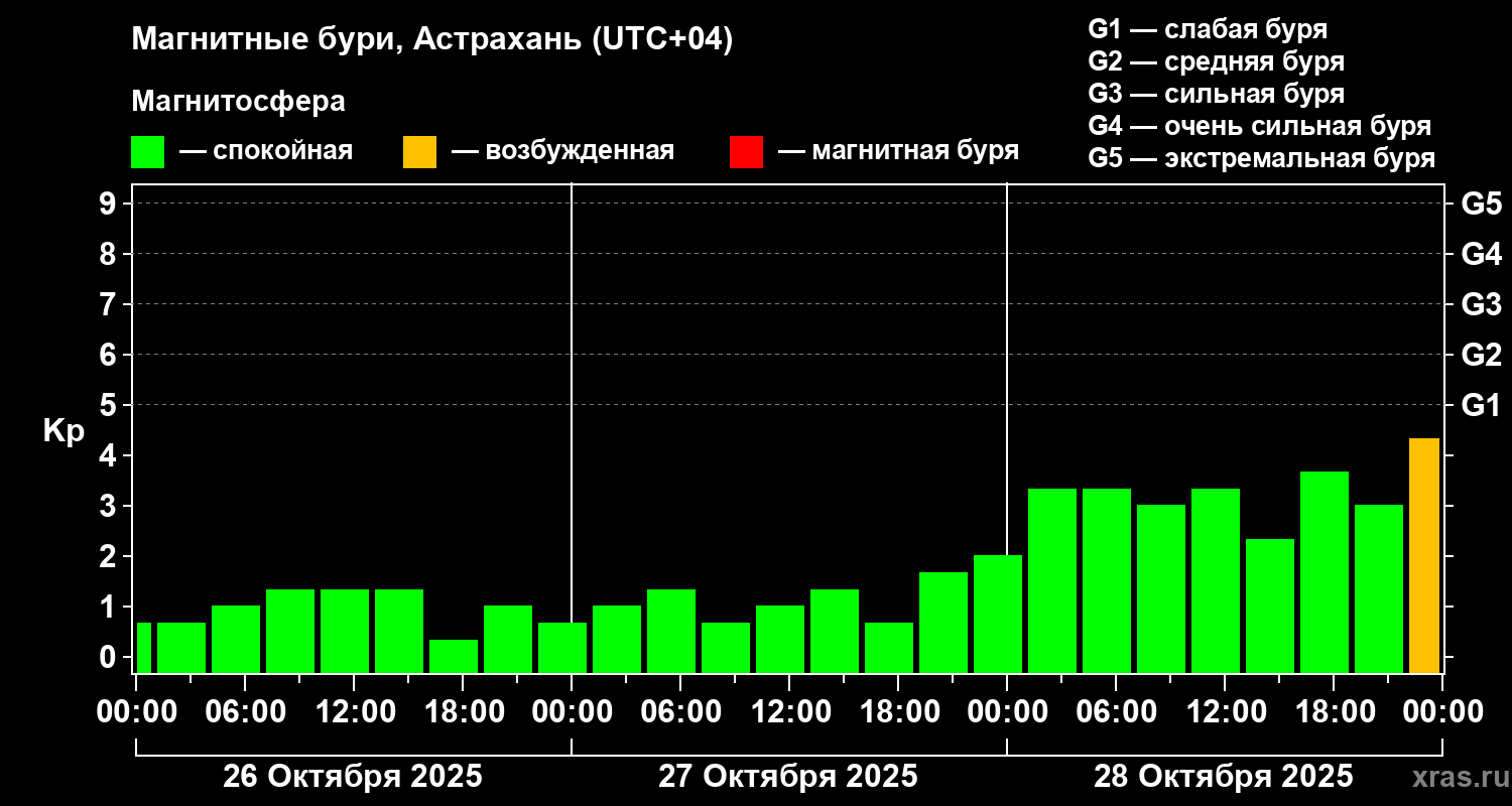 Изменения геомагнитного индекса Kp с 26 по 28 октября 2025 года для средних широт