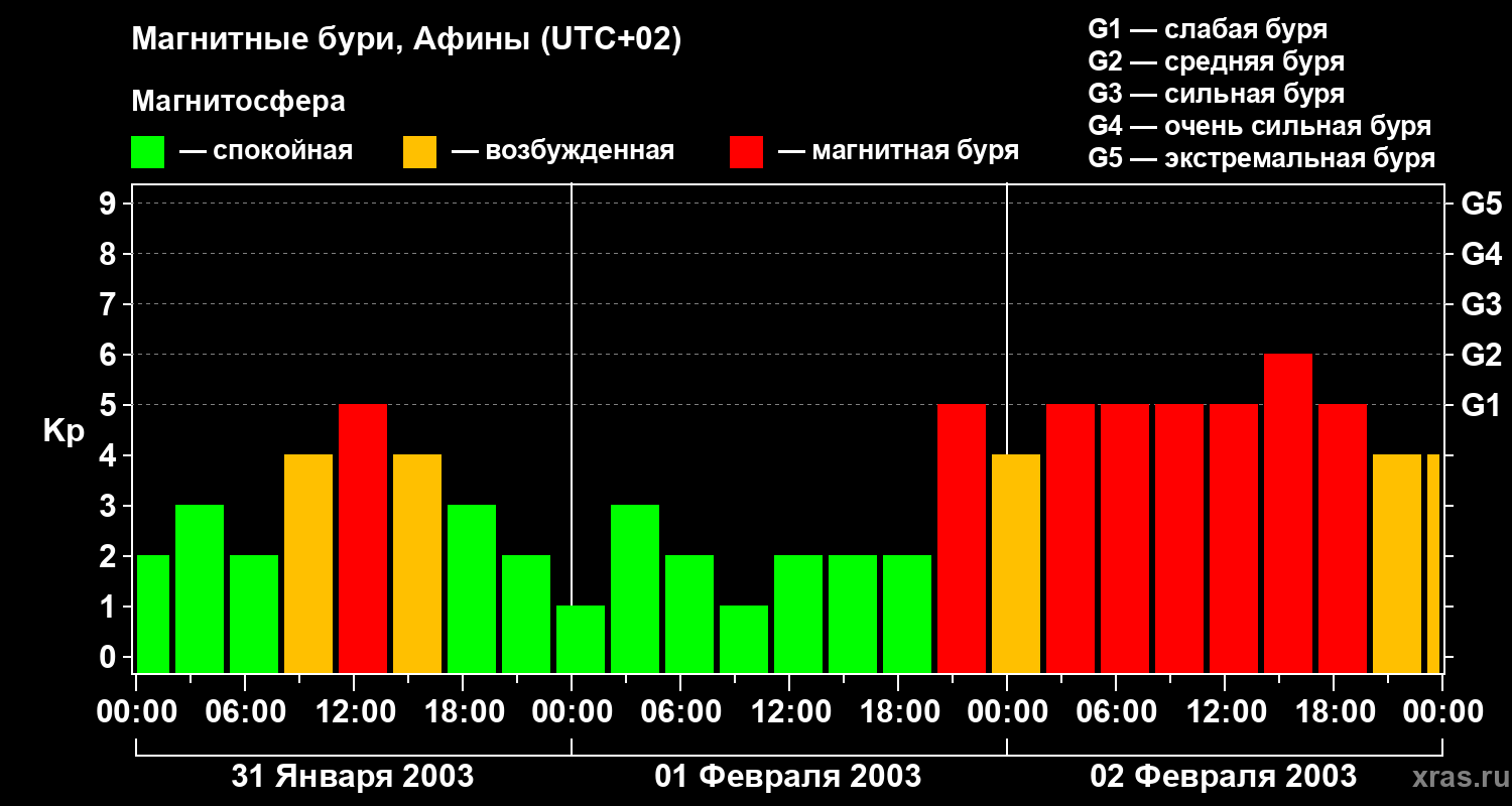 Изменения геомагнитного индекса Kp с 31 января по 2 февраля 2003 года для средних широт