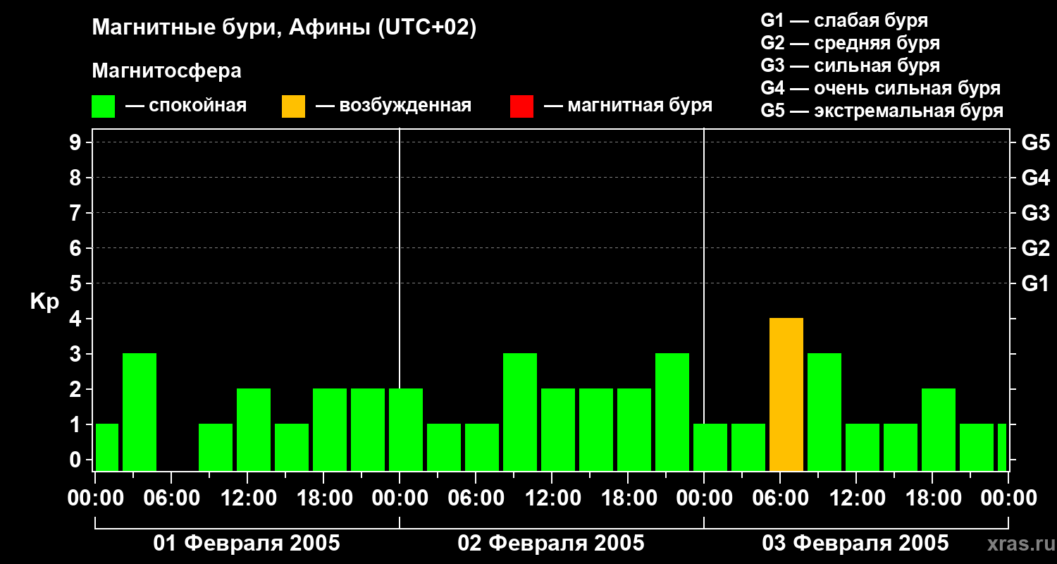 Изменения геомагнитного индекса Kp с 1 по 3 февраля 2005 года для средних широт