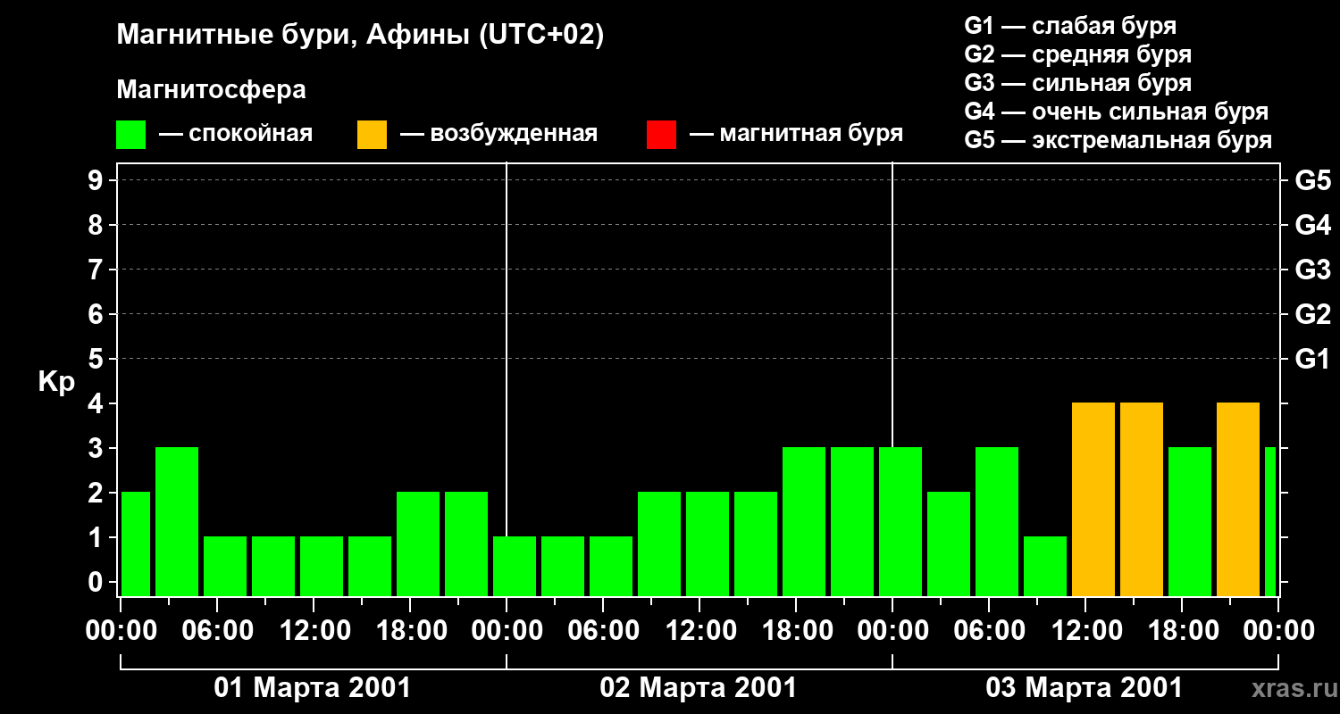 Изменения геомагнитного индекса Kp с 1 по 3 марта 2001 года для средних широт