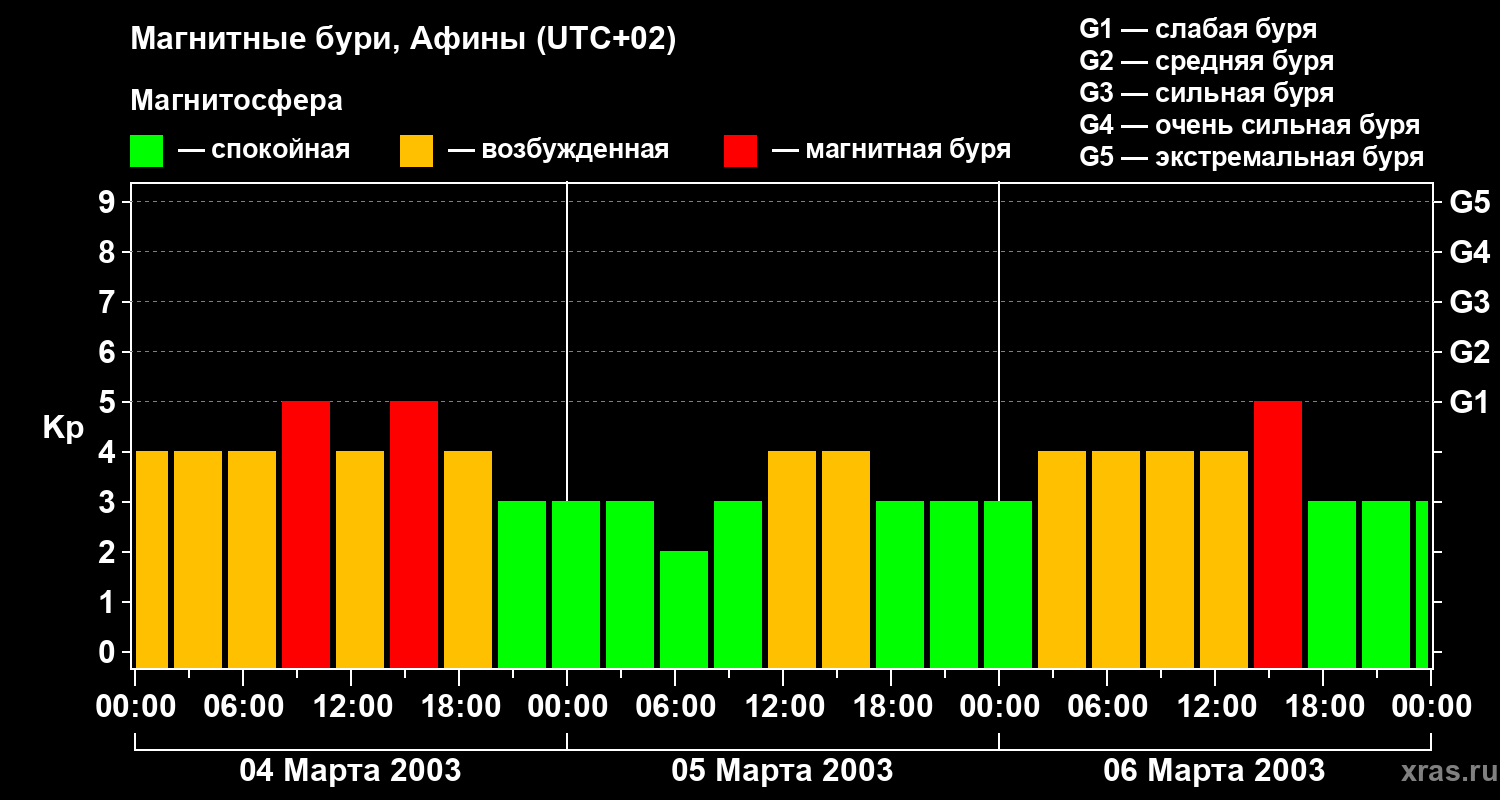 Изменения геомагнитного индекса Kp с 4 по 6 марта 2003 года для средних широт