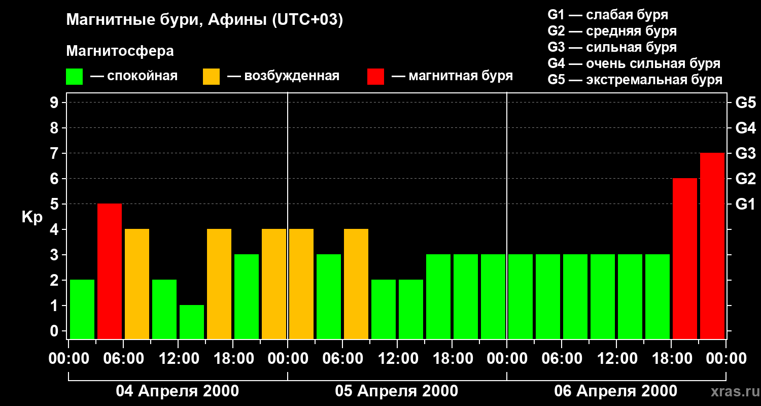 Изменения геомагнитного индекса Kp с 4 по 6 апреля 2000 года для средних широт
