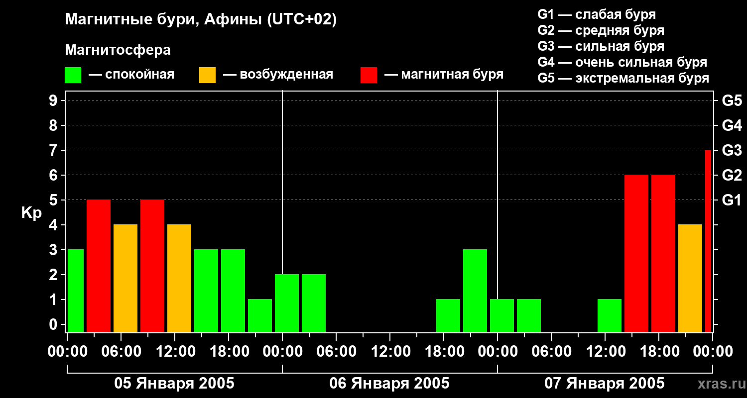 Изменения геомагнитного индекса Kp с 5 по 7 января 2005 года для средних широт
