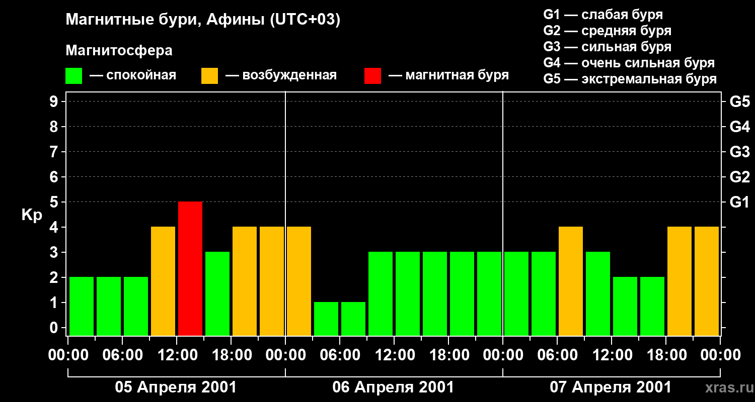 Изменения геомагнитного индекса Kp с 5 по 7 апреля 2001 года для средних широт