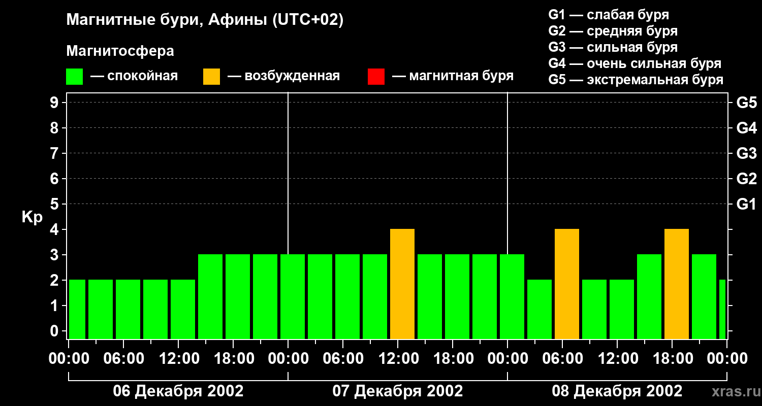 Изменения геомагнитного индекса Kp с 6 по 8 декабря 2002 года для средних широт