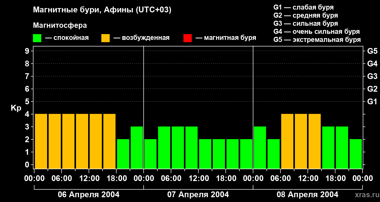 Изменения геомагнитного индекса Kp с 6 по 8 апреля 2004 года для средних широт