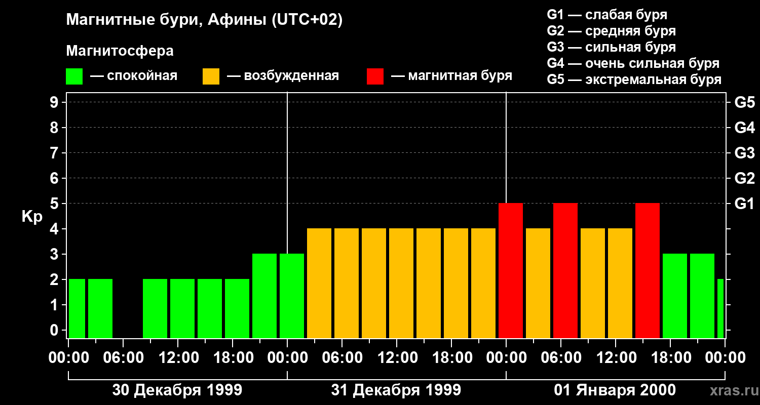 Изменения геомагнитного индекса Kp с 30 декабря 1999 года по 1 января 2000 года для средних широт
