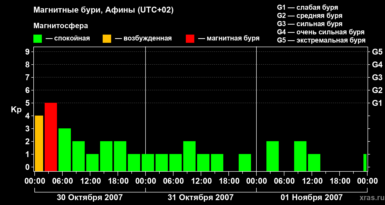Изменения геомагнитного индекса Kp с 30 октября по 1 ноября 2007 года для средних широт