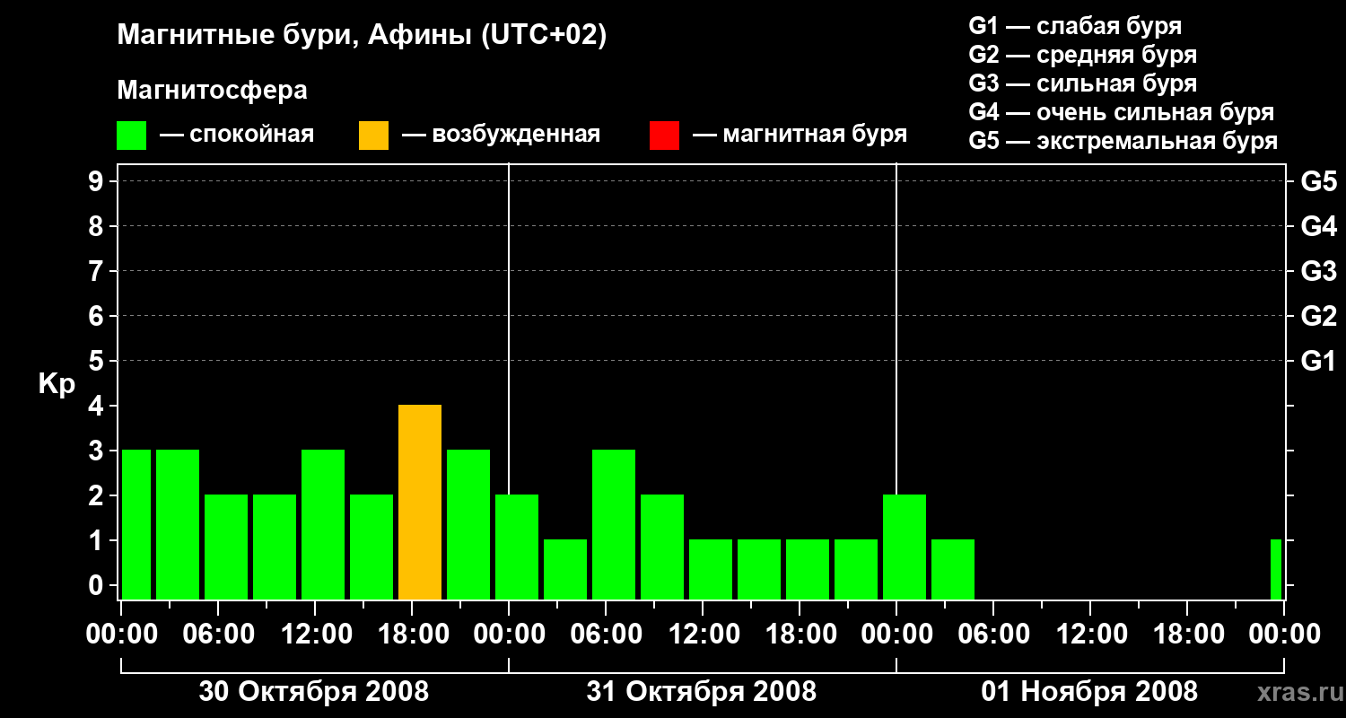 Изменения геомагнитного индекса Kp с 30 октября по 1 ноября 2008 года для средних широт