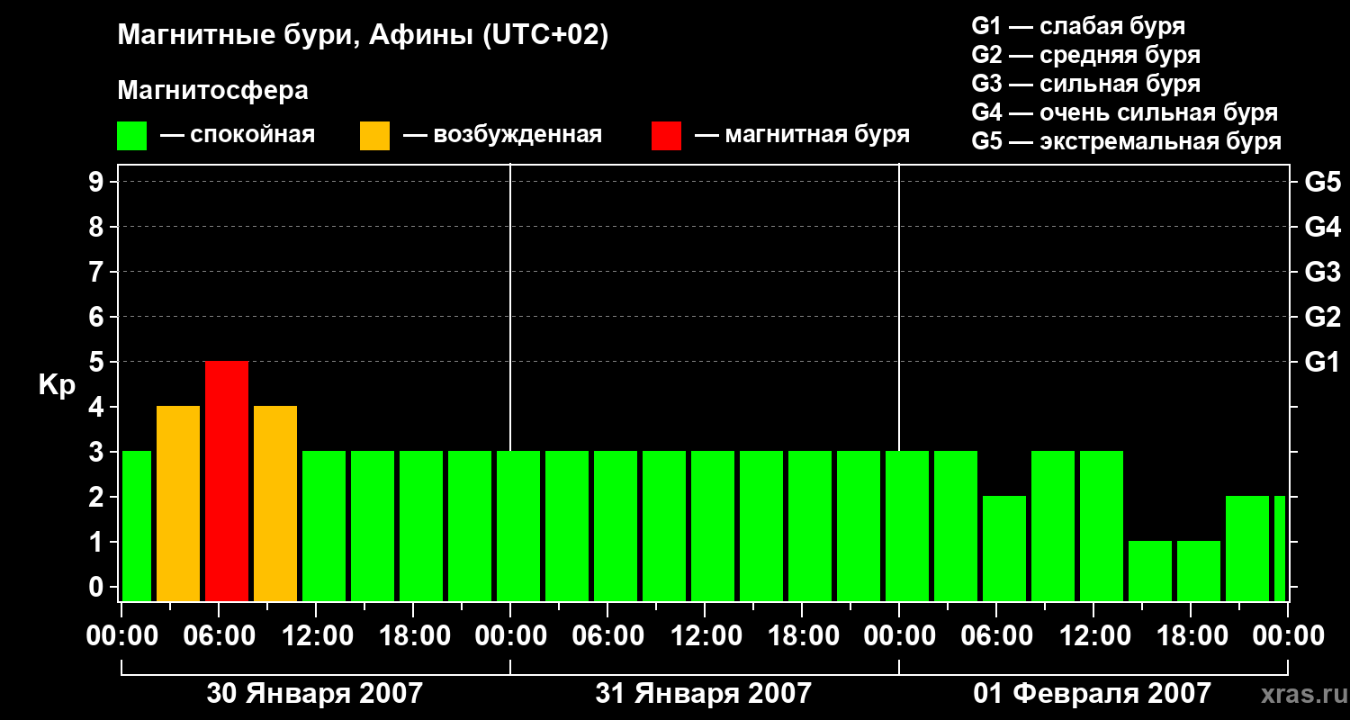 Изменения геомагнитного индекса Kp с 30 января по 1 февраля 2007 года для средних широт
