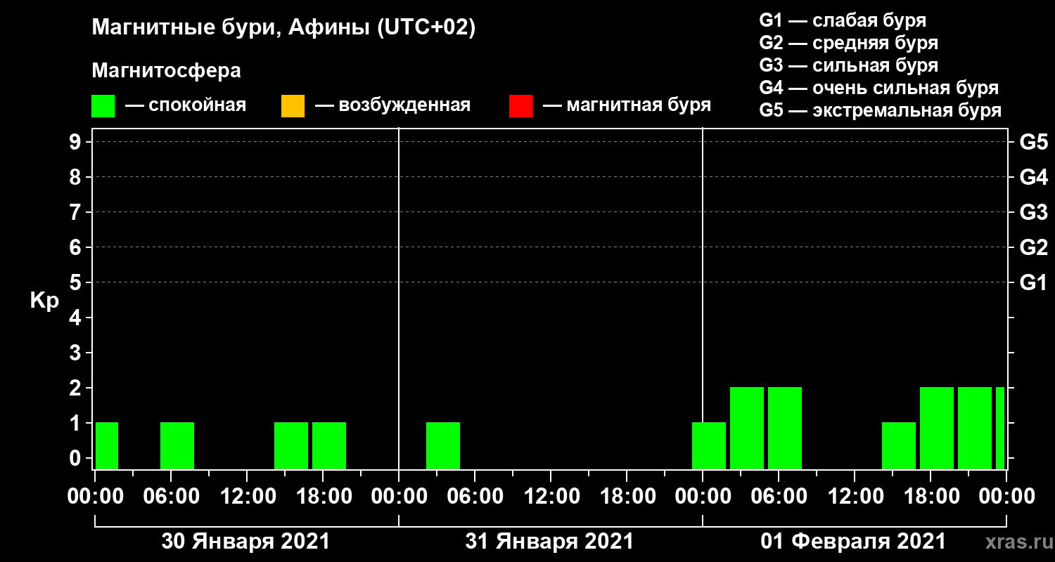 Изменения геомагнитного индекса Kp с 30 января по 1 февраля 2021 года для средних широт