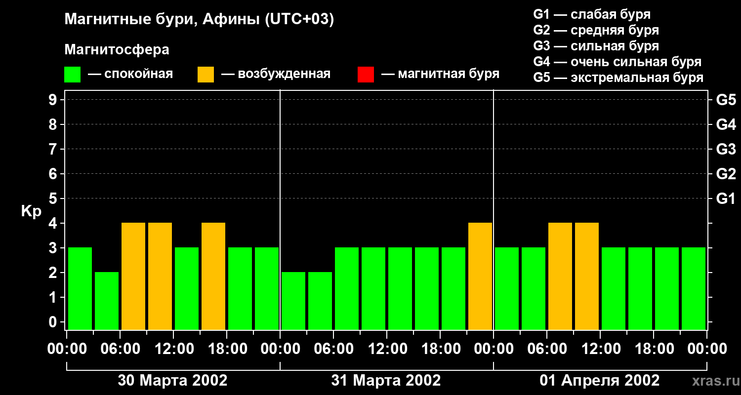 Изменения геомагнитного индекса Kp с 30 марта по 1 апреля 2002 года для средних широт