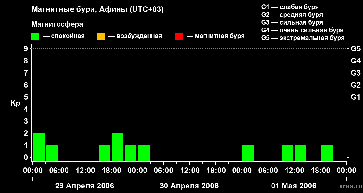 Изменения геомагнитного индекса Kp с 29 апреля по 1 мая 2006 года для средних широт