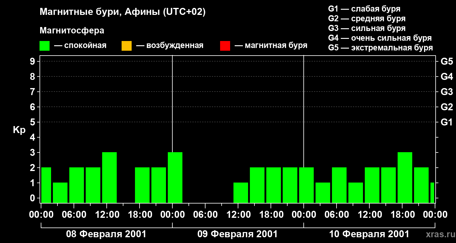 Изменения геомагнитного индекса Kp с 8 по 10 февраля 2001 года для средних широт
