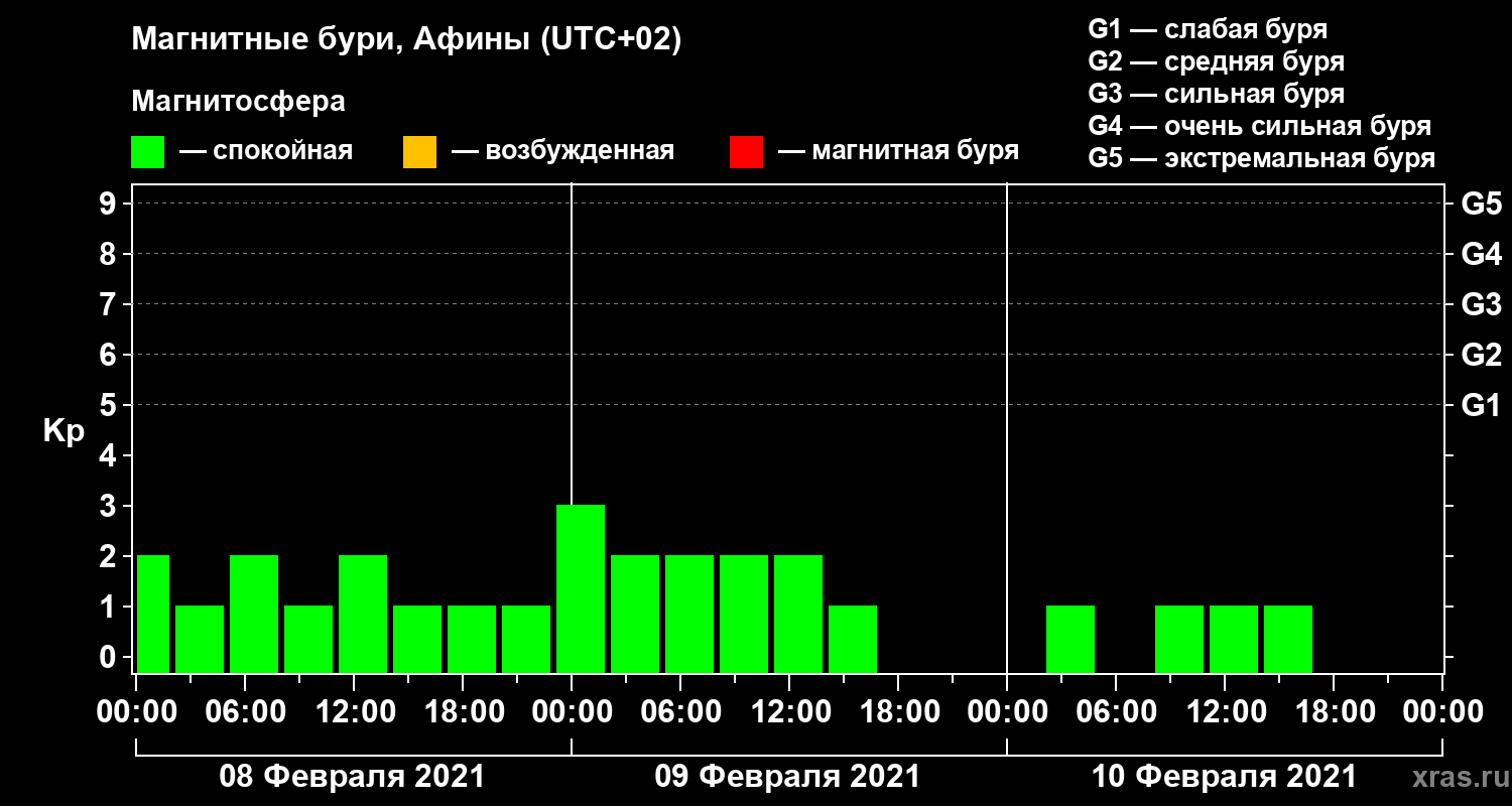 Изменения геомагнитного индекса Kp с 8 по 10 февраля 2021 года для средних широт
