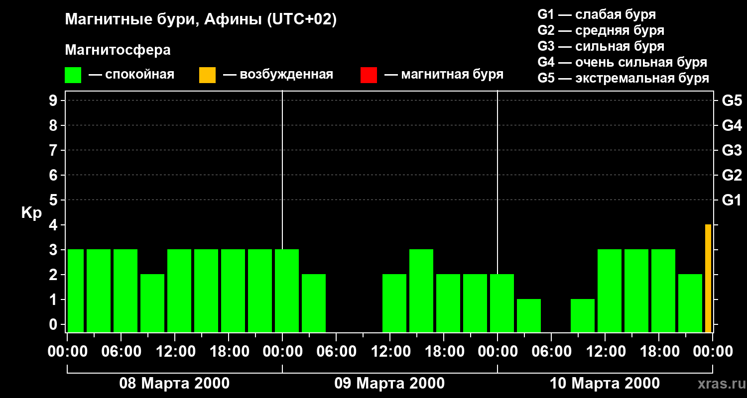 Изменения геомагнитного индекса Kp с 8 по 10 марта 2000 года для средних широт