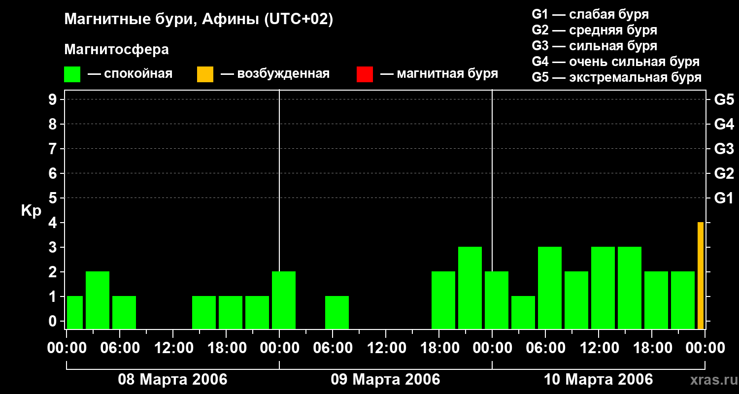 Изменения геомагнитного индекса Kp с 8 по 10 марта 2006 года для средних широт