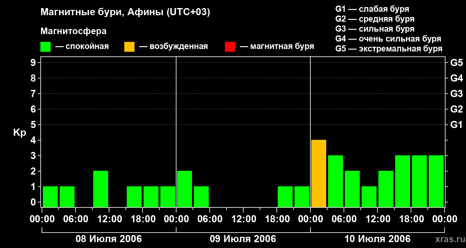 Изменения геомагнитного индекса Kp с 8 по 10 июля 2006 года для средних широт