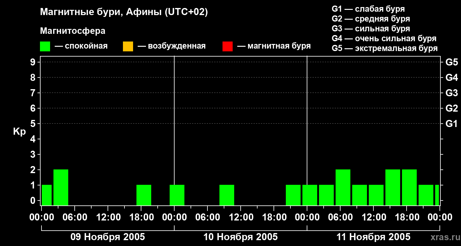 Изменения геомагнитного индекса Kp с 9 по 11 ноября 2005 года для средних широт