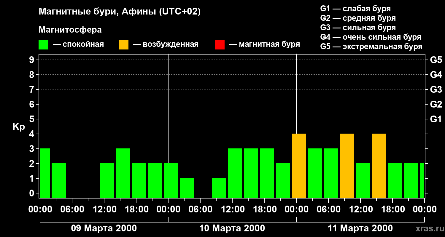 Изменения геомагнитного индекса Kp с 9 по 11 марта 2000 года для средних широт