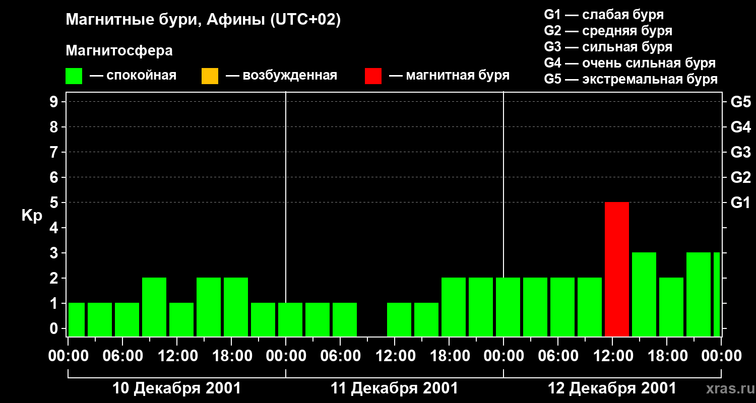 Изменения геомагнитного индекса Kp с 10 по 12 декабря 2001 года для средних широт