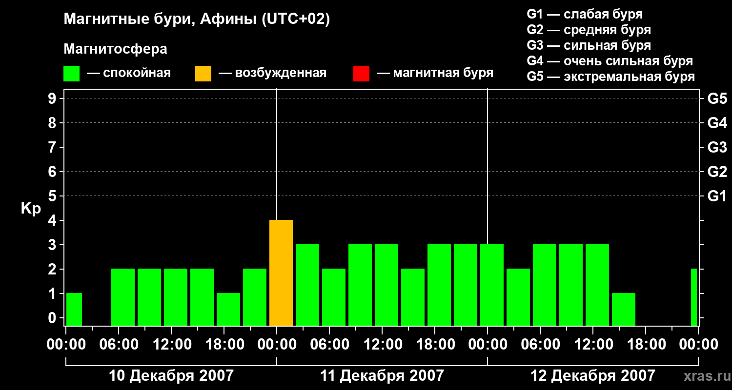 Изменения геомагнитного индекса Kp с 10 по 12 декабря 2007 года для средних широт