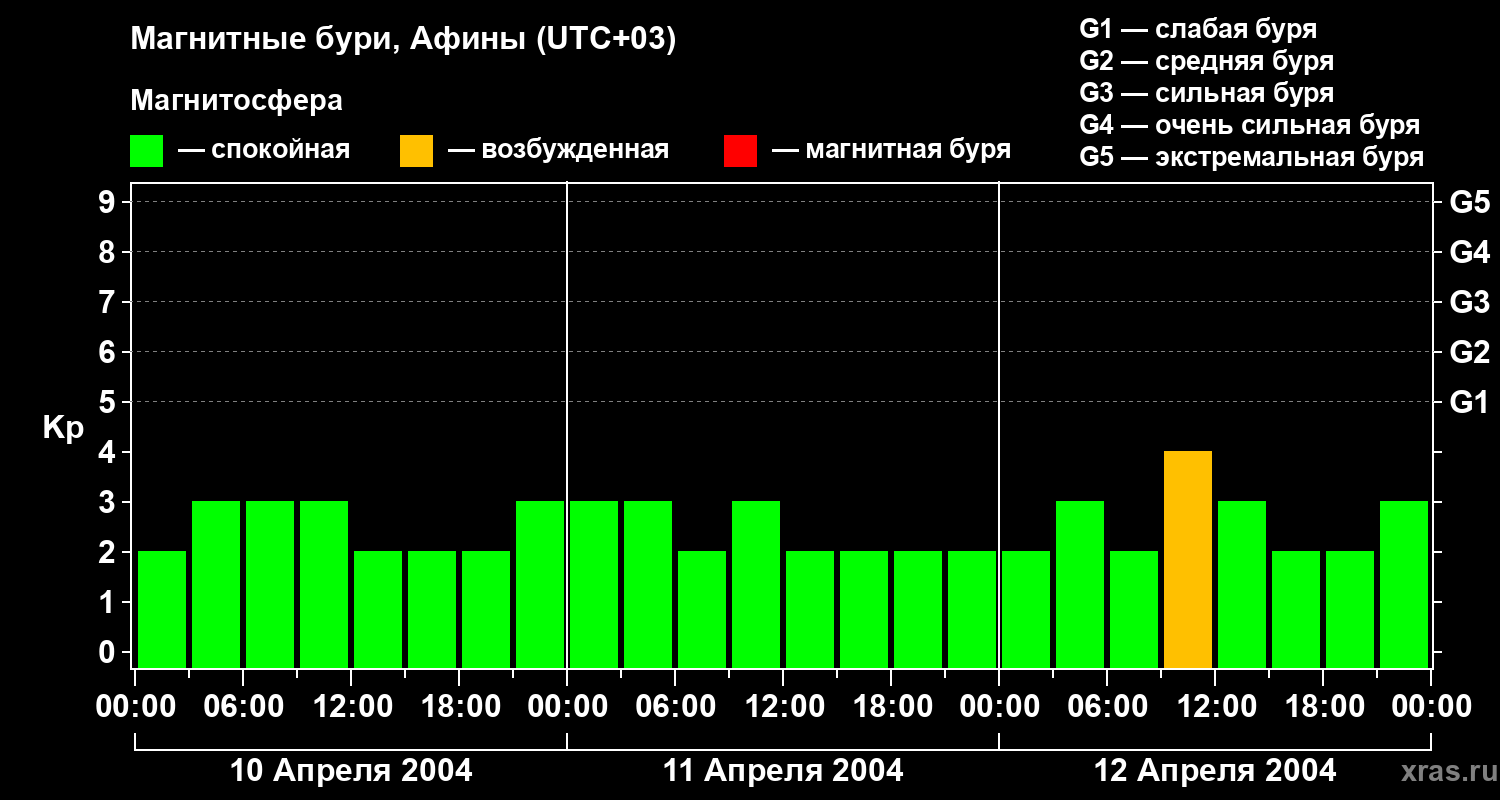Изменения геомагнитного индекса Kp с 10 по 12 апреля 2004 года для средних широт