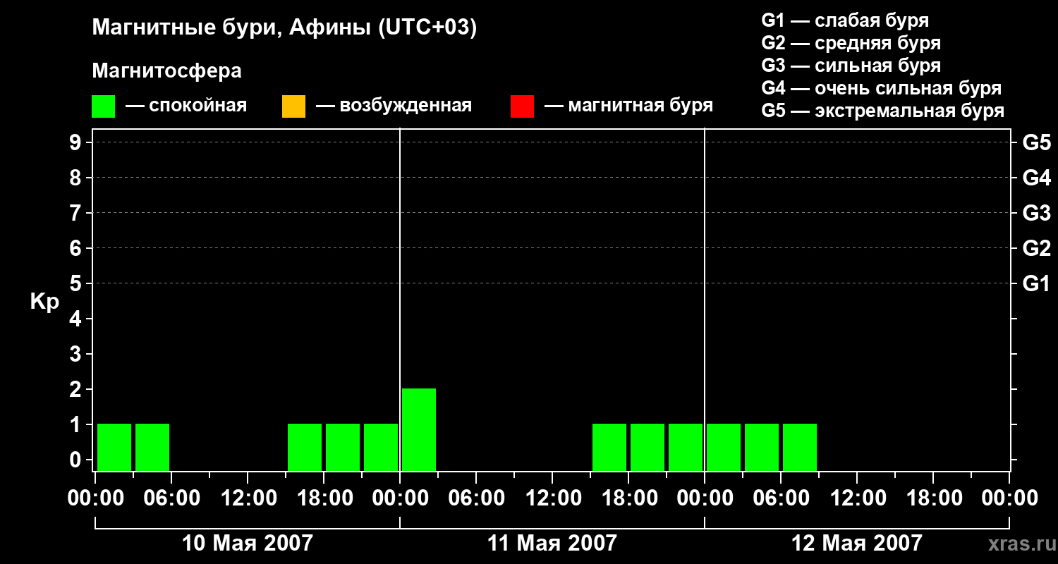 Изменения геомагнитного индекса Kp с 10 по 12 мая 2007 года для средних широт