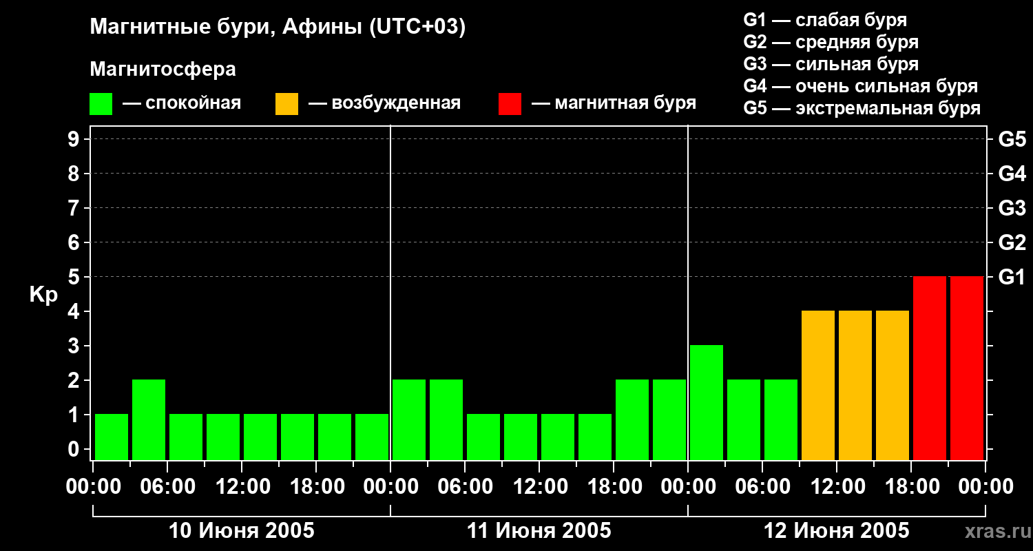 Изменения геомагнитного индекса Kp с 10 по 12 июня 2005 года для средних широт