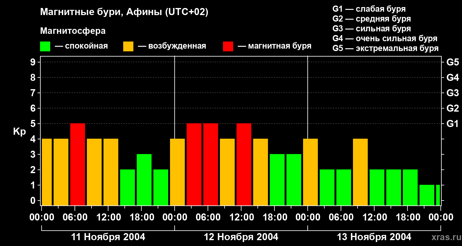 Изменения геомагнитного индекса Kp с 11 по 13 ноября 2004 года для средних широт