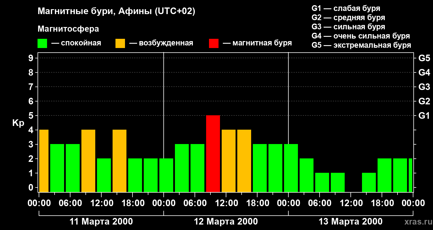 Изменения геомагнитного индекса Kp с 11 по 13 марта 2000 года для средних широт