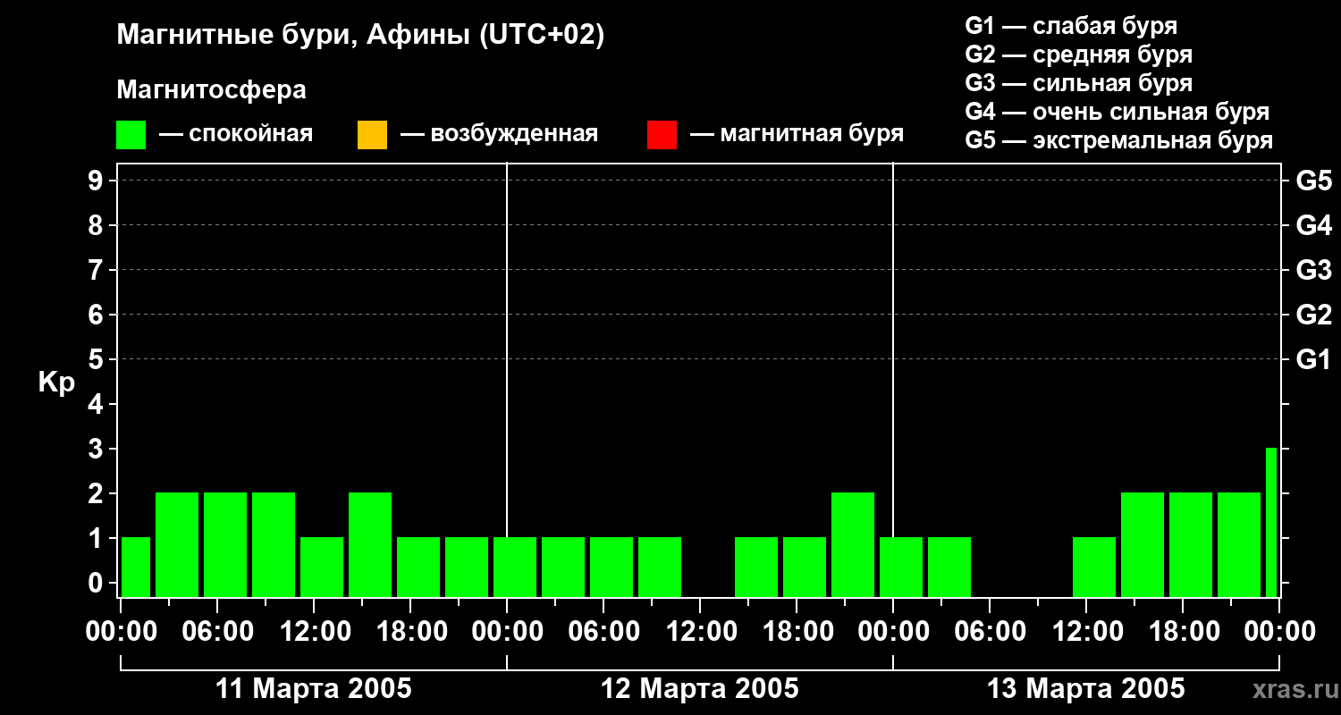 Изменения геомагнитного индекса Kp с 11 по 13 марта 2005 года для средних широт